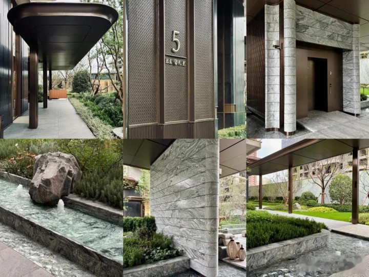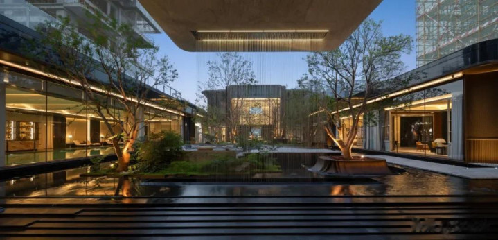不仅铺设走漏南北200m的景不雅中轴、还将社区举座举高近7m,以“金虹飞渡”设定主入语气场,古铜构件嵌入的乌金龙脊状铝板,和两侧全心设想的龙鳞墙面,围合出400多㎡对称水院,身处其中,既可收城市中轴地标于眼底,又能无缝穿梭于立体“辋川画卷”。