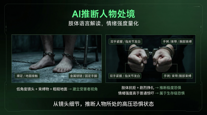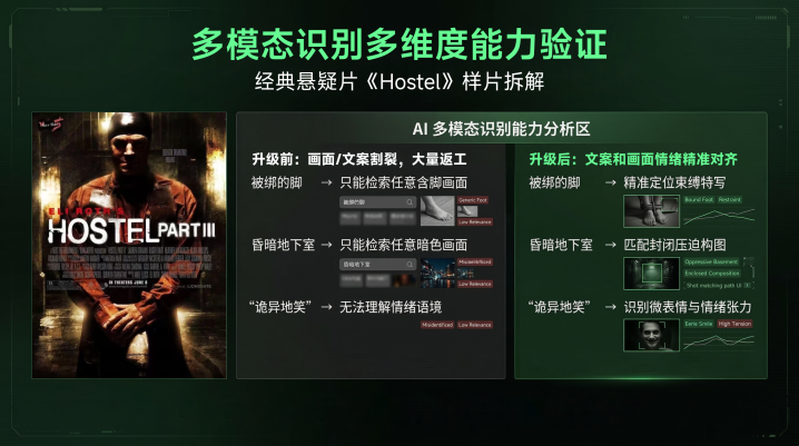 恐怖悬疑片有一个至极凸起的特色:画面大部分是低光暗调。东谈主在暗影里、物件在暗处、镜头里一半的信息要靠你仔细看才智鉴识出来。这就意味着传统那套靠文献名、靠毛糙标签来惩处素材的方法王人备废了。你给素材打个室内、暗、东谈主物这样的标签,打完之后我方都找不到——你想找一个扮装在地下室里被铁链锁住的镜头,这个标签系统会复返给你几百个室内暗东谈主物的片断,等于没打。