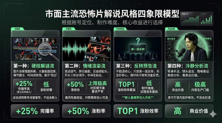 讲完难点,说一下具体如何作念。我把市面上能跑出来的恐怖片评释约莫分红四种立场,你不错把柄我方的账号定位选一种切入。