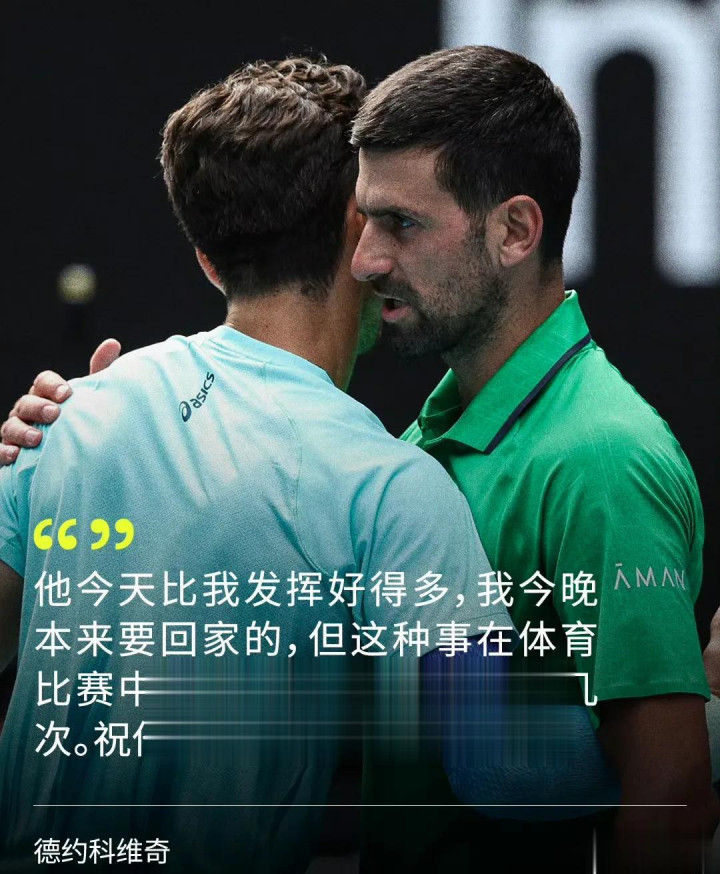 赛后采访,德约科维奇再现高情商发言,他说,“我不知道该说什么,只能说我为他感到遗憾。他是比赛中远比我出色的选手,今晚我本该收拾行李回家。在大满贯的1/4决赛中领先两盘,完全掌控局面。真是太不幸了。我不知道还能说什么。我祝他早日康复,今天毫无疑问他本该是获胜者。”