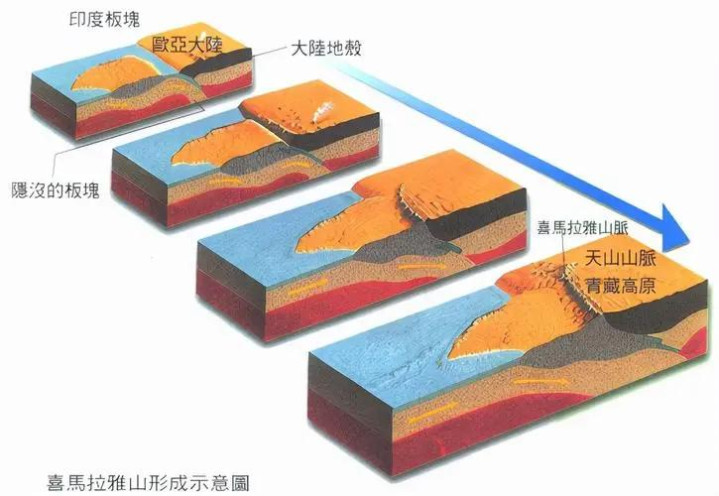 喜马拉雅山脉即是印度板块和欧亚板块碰撞的产品,这个碰撞从大要5000万年前初始,于今仍在不绝。板块抬升速率约为每年4毫米,但受侵蚀对消,净增长约为每年2毫米。