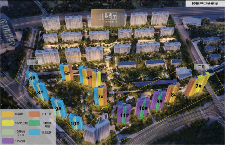 权略12栋住宅楼,北排6栋为18F小高层,南排为10F/11F洋房,计划1358户,户均建面100.6㎡。