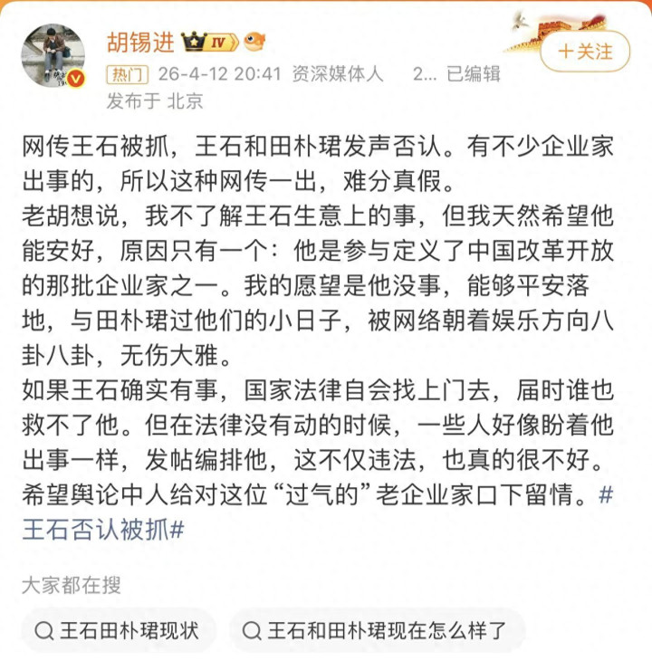 这不合于这件事情,闻明大V胡锡进,也在微博发表了我方的宗旨。然而他和网友们的宗旨不雷同,他反而是但愿王石好,而不是果真被握。