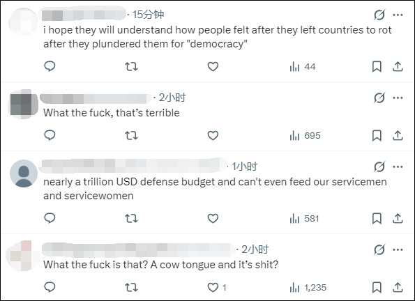 看到好意思军士兵共享的这份餐食图后,在应付媒体X平台上,网民们的评述是这么的……